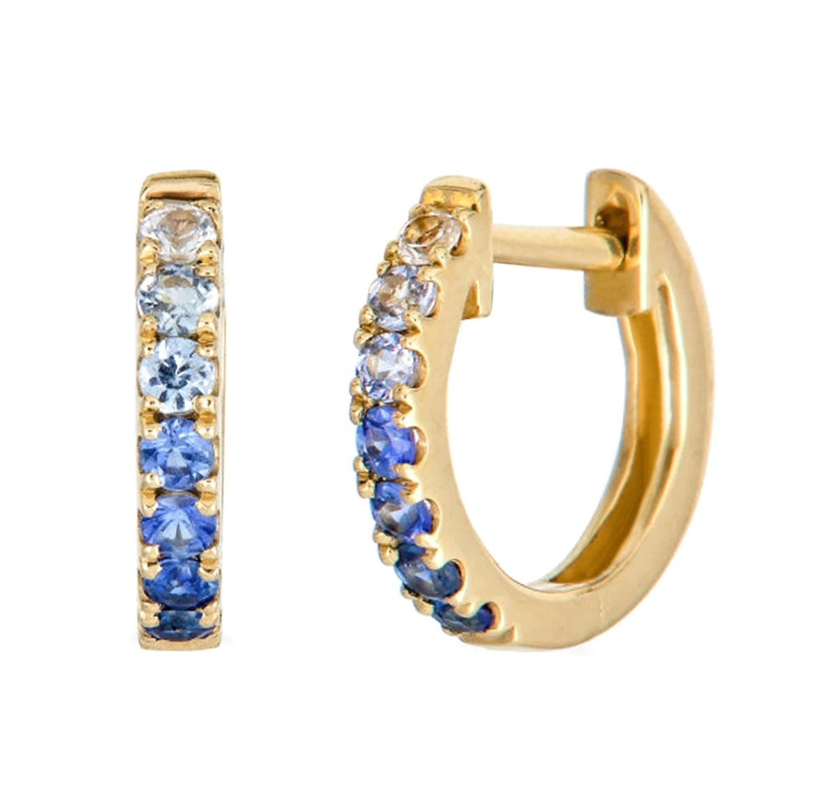14k gold. Sapphire Huggies. Lighter to darker hues. A perfect pop and classic to add to your collection.